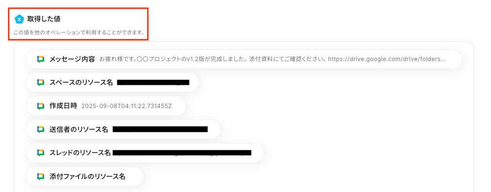 これにより、Google Chatのメッセージごとに変わる情報をSlackへ動的に反映できます。