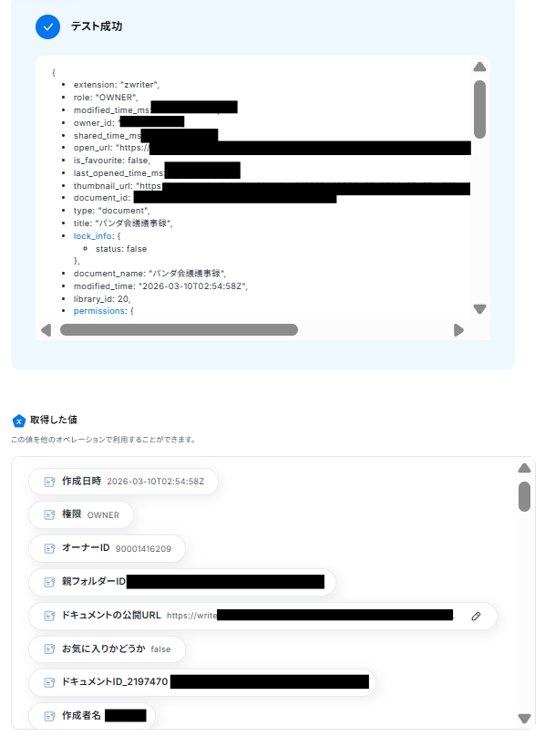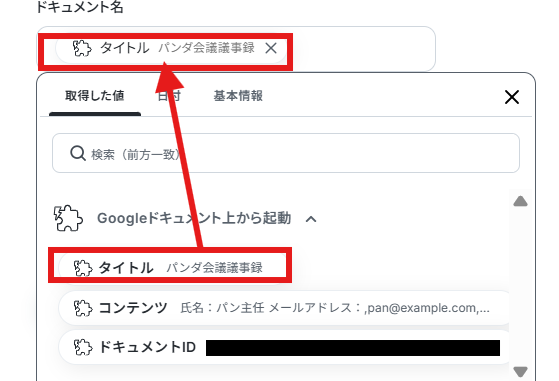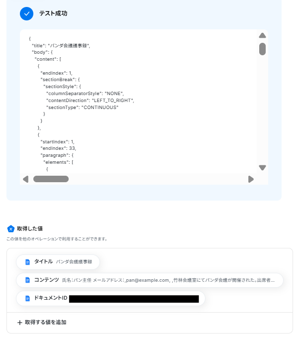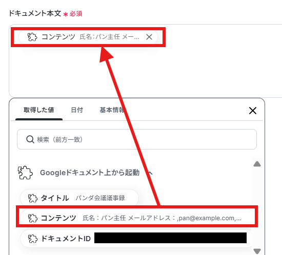 「ドキュメント本文」には取得した値から「コンテンツ」を入力しましょう。