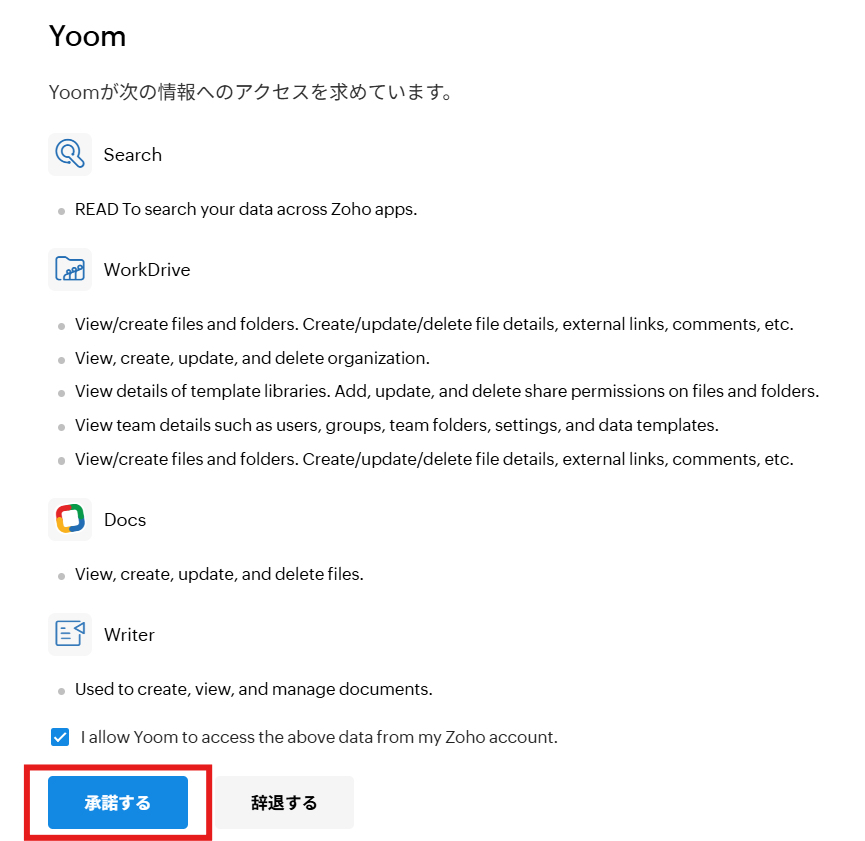 権限設定のページに遷移しますので、権限をすべて許可してください。チェックボックスにチェックを入れて、「承諾する」をクリックすればOKです。