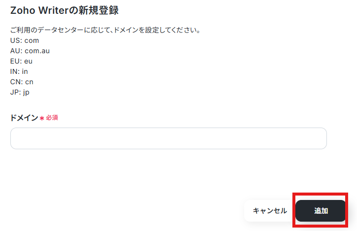 Zoho上でお使いのデータセンターに応じて、ドメインを登録します。
