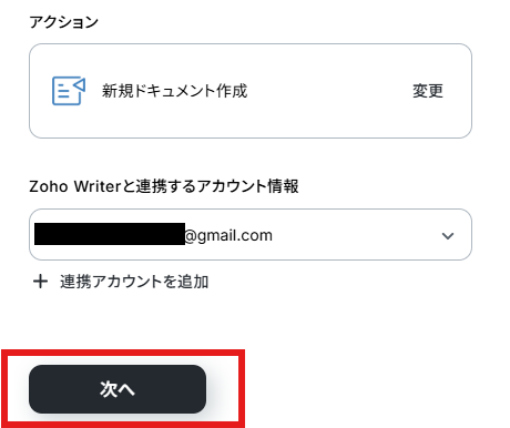アクションはデフォルト設定のまま、アカウント情報は、連携したいアカウントが選択されているか確認してください。確認出来たら「次へ」をクリックしましょう。