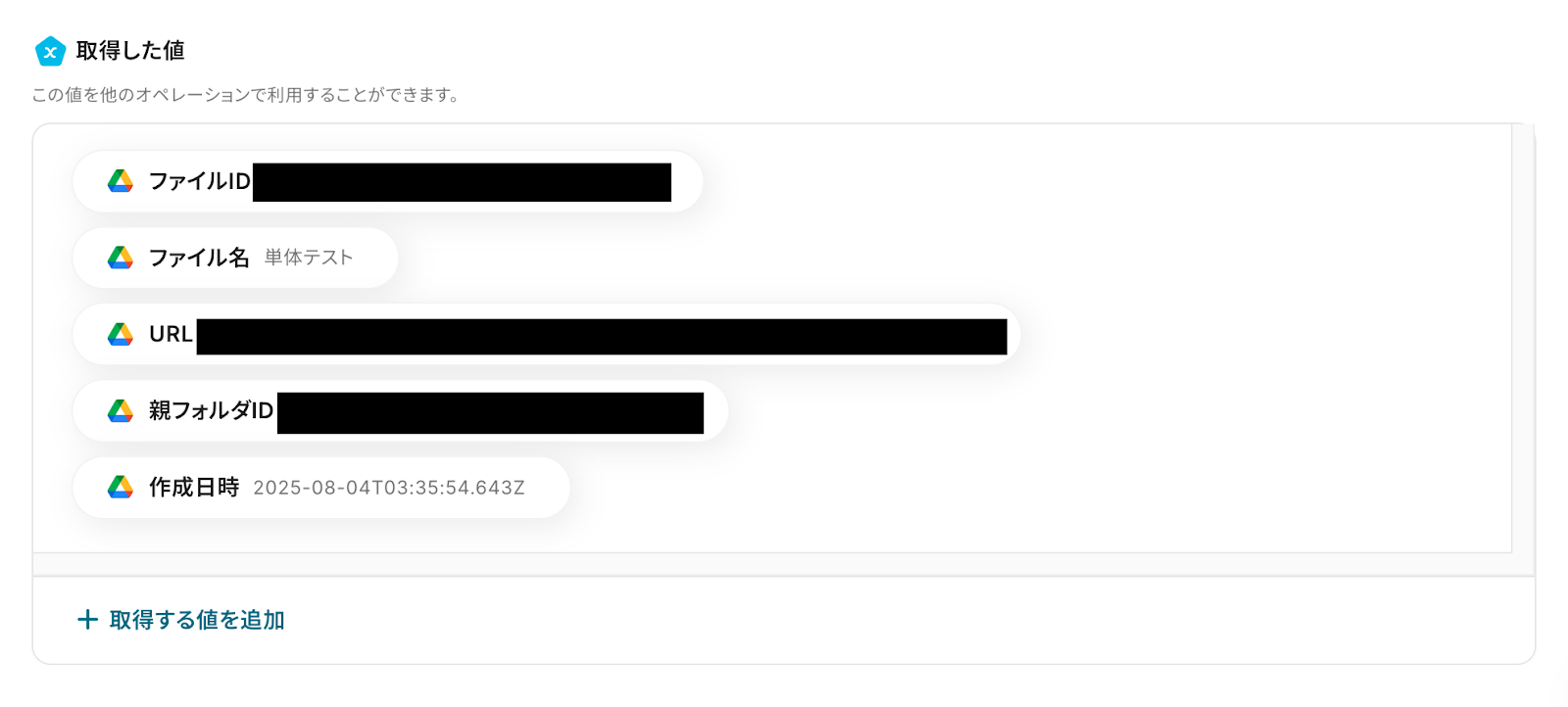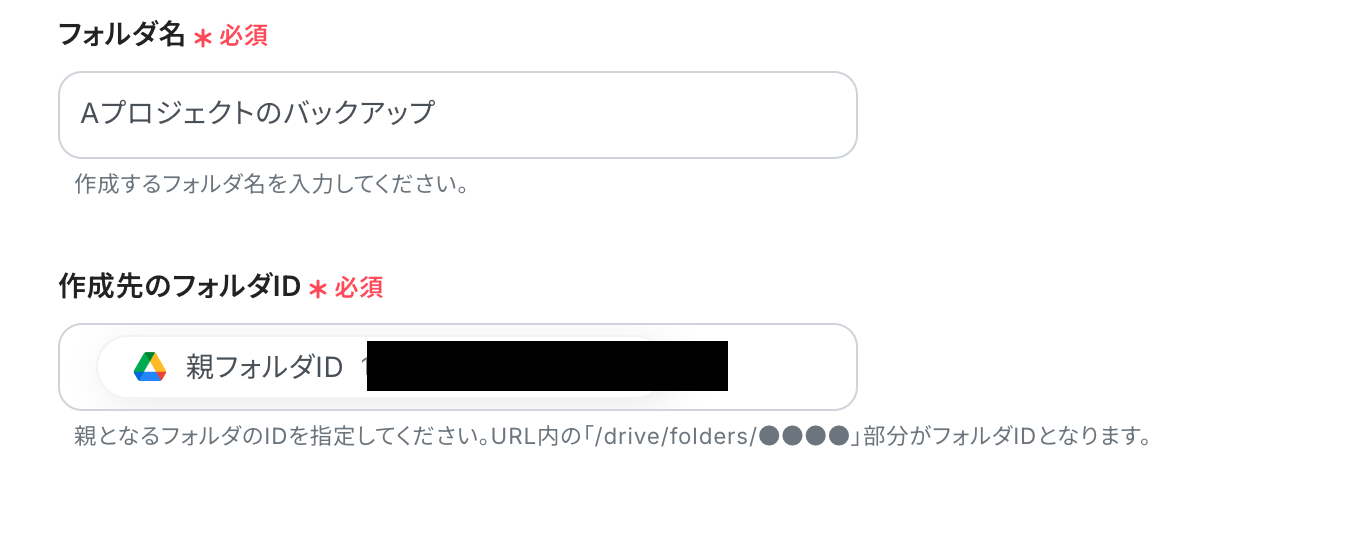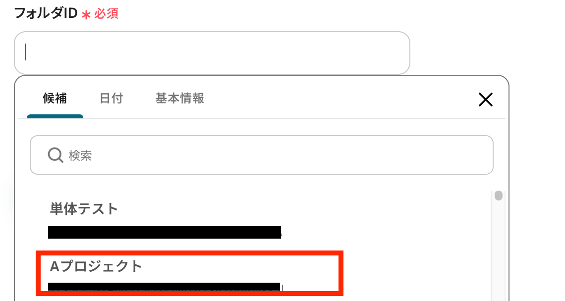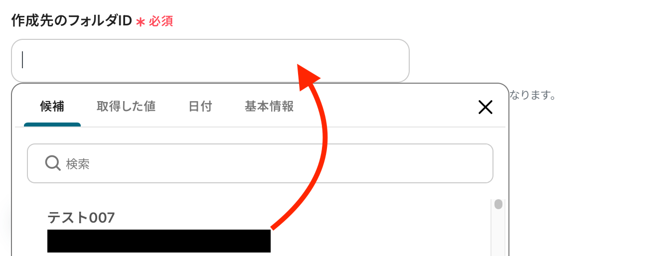 フォルダ名を任意で記入しましょう。取得した値から選択することもできます。