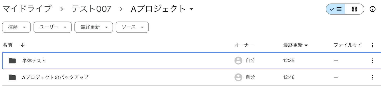 Google Driveの特定のフォルダ内に新規フォルダを作成し、テストをクリックしてください。