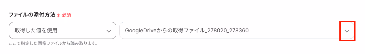 次の画面で、ファイルの添付方法は「取得した値を使用」、右側のプルダウンをクリックし、前項で取得した値からファイルを選択してください。