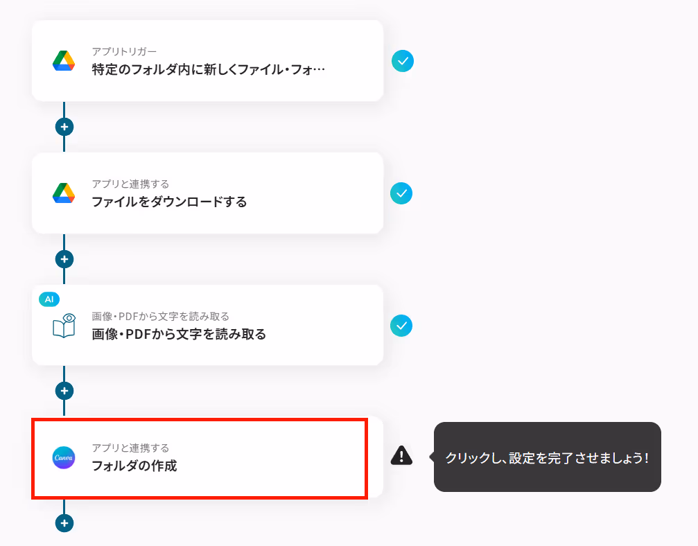 Google Drive内の指定したフォルダに新しいファイルが追加されたことをトリガーにして、OCRでファイル内の情報を読み取り、その情報を基にCanvaでフォルダを自動作成するフローを構築します。