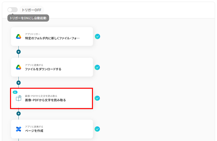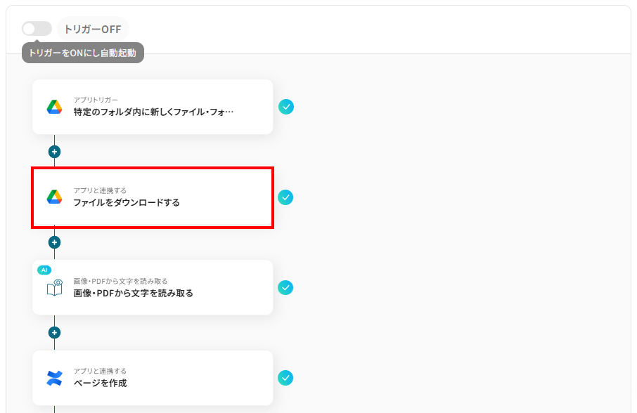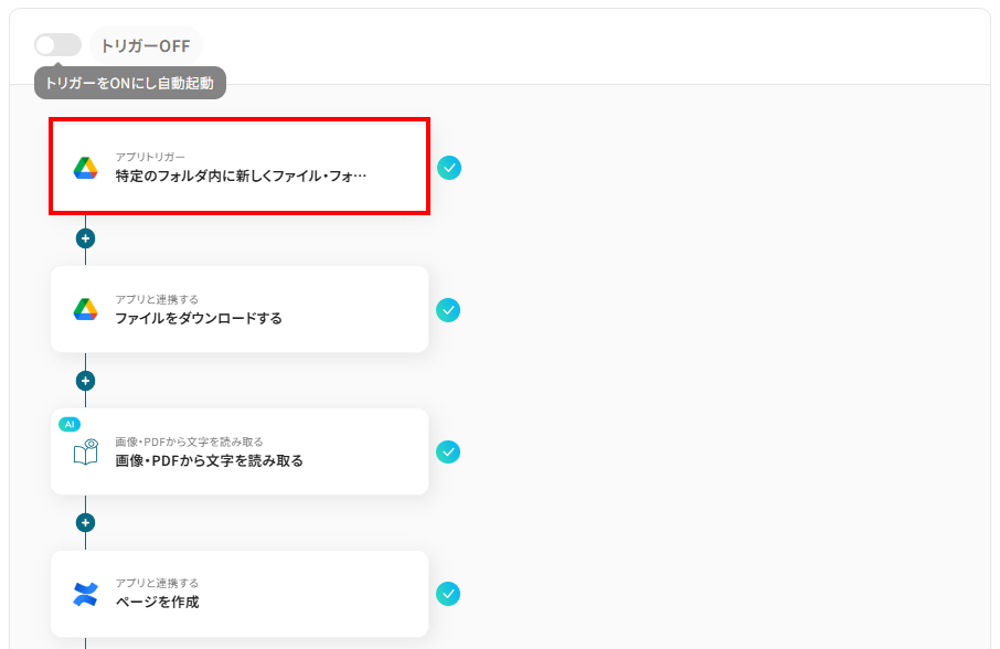 ファイル名に「議事録」といった特定のキーワードが含まれるファイルがGoogle Driveに格納された場合のみ、OCRでテキストを抽出しConfluenceにページを作成する、といった条件分岐を含む自動化も可能です。