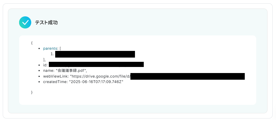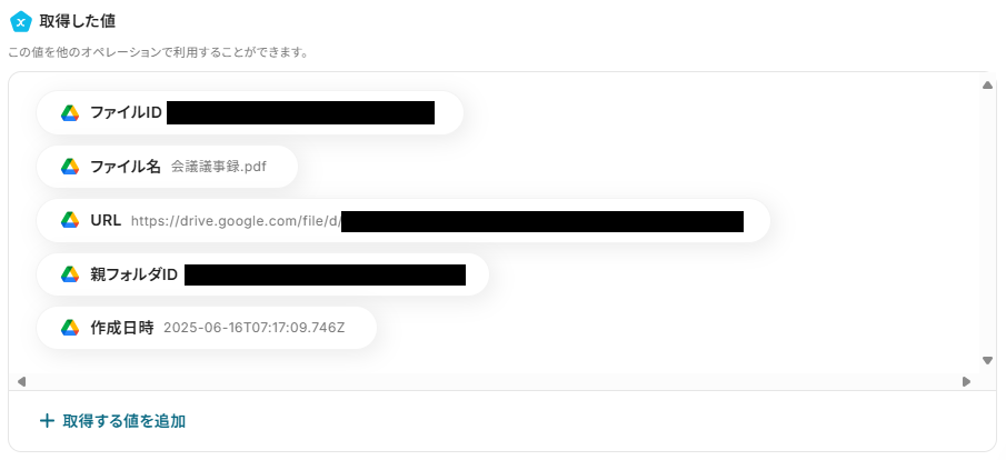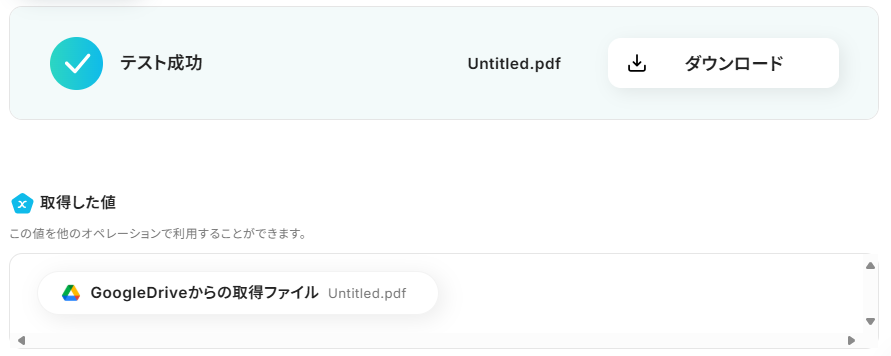 設定できたら「テスト」を行いましょう。 テストに成功すると、「取得した値」にGoogle Driveの情報が反映されます。 この値は次のステップで活用します!