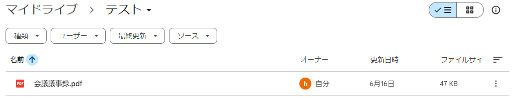 まず事前準備として、Google Driveの特定フォルダにファイルを格納してください。 今回は例として「テスト」フォルダを作成し、会議議事録のPDFファイルをアップロードしました。 このフォルダにファイルがアップロードされたら、トリガーが起動するよう設定していきます!
