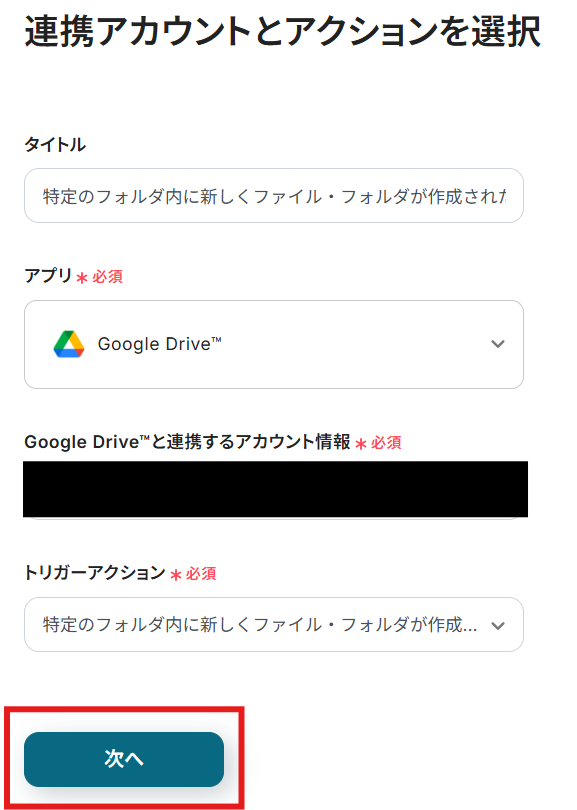 タイトルは任意で分かりやすいものに変更してOKです。 また、連携するアカウント情報は、トリガーとしたいアカウントが設定されているか確認してください。 トリガーアクションはテンプレート通りに「特定のフォルダ内に新しくファイル・フォルダが作成されたら」のまま、「次へ」をクリックしましょう。