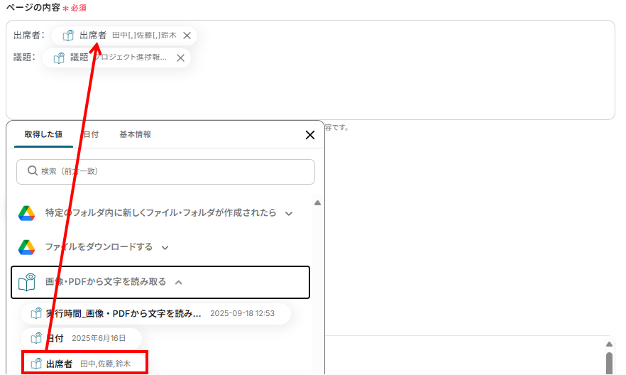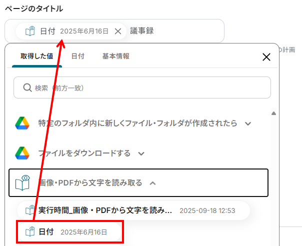 ページのタイトル:こちらには、前のステップで取得した情報を引用して入力してください。 今回は、以下のようなタイトルにしましたが、運用内容に合わせて固定値のテキストと「取得した値」を組み合わせて、カスタマイズ可能です。