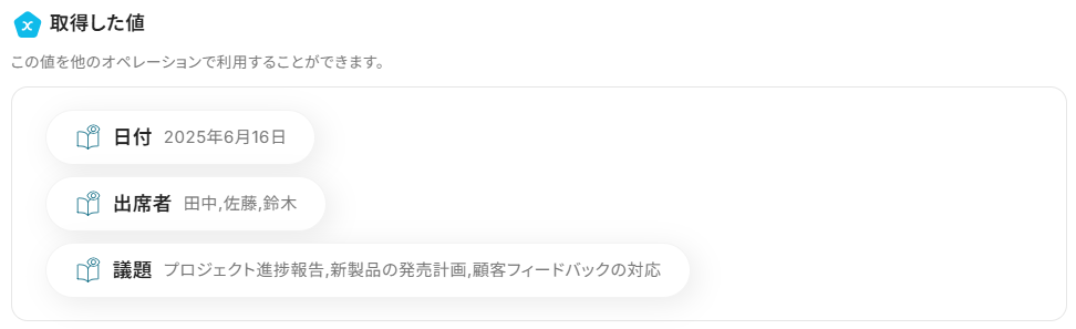 ※取得した値 とは、トリガーやオペレーションにて取得した値を指します。 取得した値は、オペレーション設定時の値としてご利用いただくことができ、フローボットを起動する度に、変動した値となります。