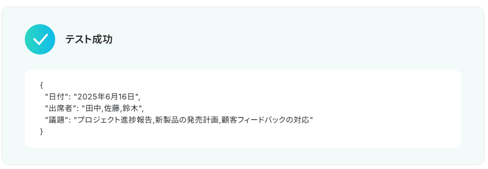 設定が完了したら、「テスト」をしましょう。 アップロードしたファイルから、指示した項目通りテキストが抽出できていればOKです!