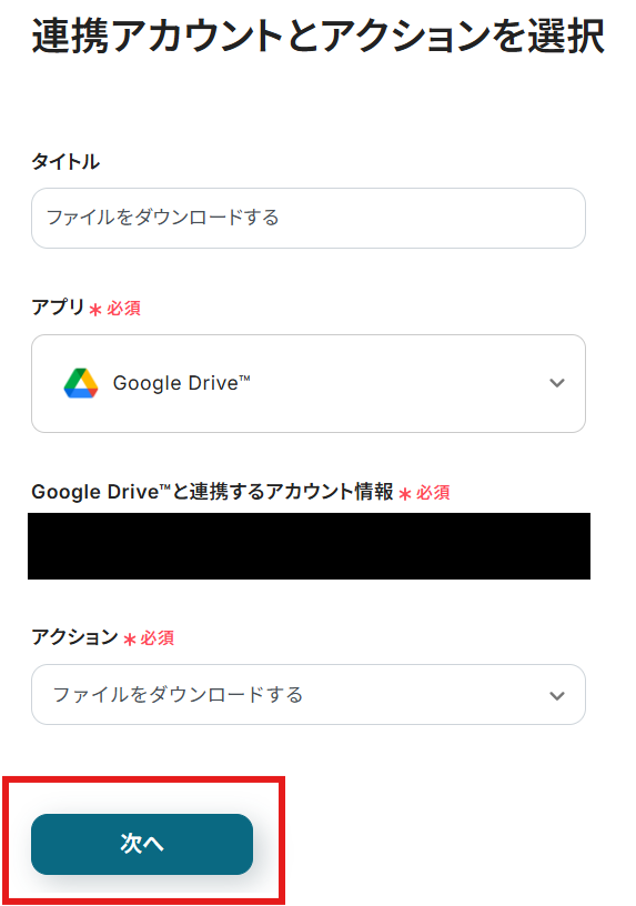 ここでは、先ほどのトリガーで取得した情報をもとに、ファイルをダウンロードします。 下記赤枠の「ファイルをダウンロード」をクリック。