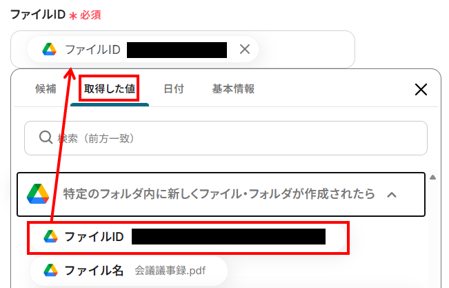 続いて、「フォルダID」の入力欄をクリックして表示された候補から選択しましょう。 ここでは、先ほど作成した「テスト」フォルダにファイルが作成された時にフローボットが起動するように設定しました! なお、この候補は前のページで選択したアカウント情報に紐づいて表示されます。