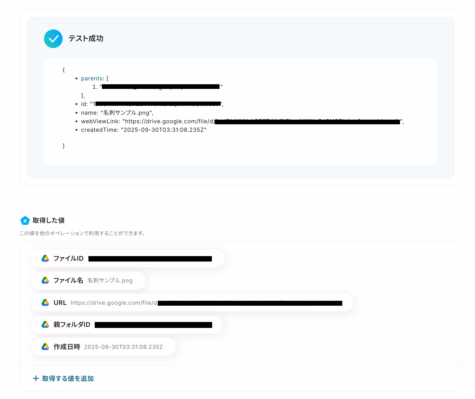 テストが成功すると、先ほどアップロードしたファイル情報が「取得した値」にアウトプットとして抽出されるので、内容を確認しましょう。
