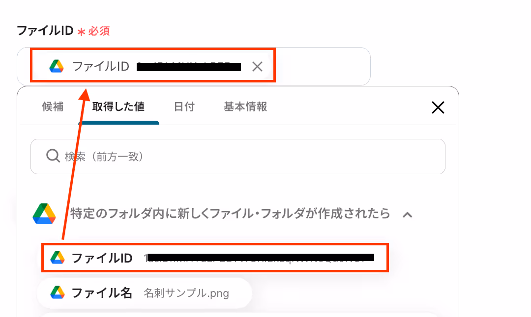 次に、「ファイルID」をステップ3で「取得した値」を使って設定します。
