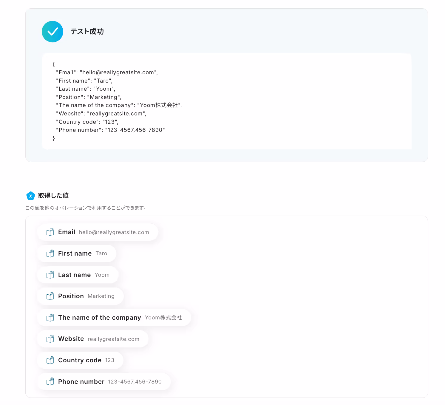 テストを成功させることで「取得した値」が取得でき、前述したように後続のオペレーション設定時に活用できます。