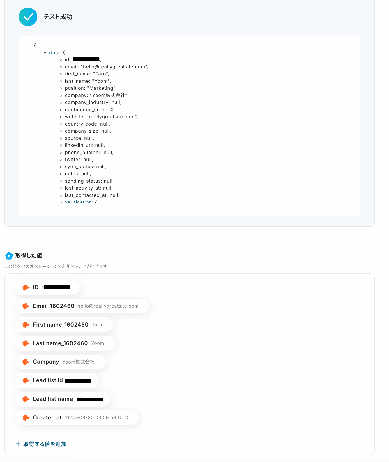 このように「取得した値」を使うことで、GoogleDriveにアップロードされたファイルから抽出したテキストデータをそのまま引用し、Hunterにリードを作成できるようになります。