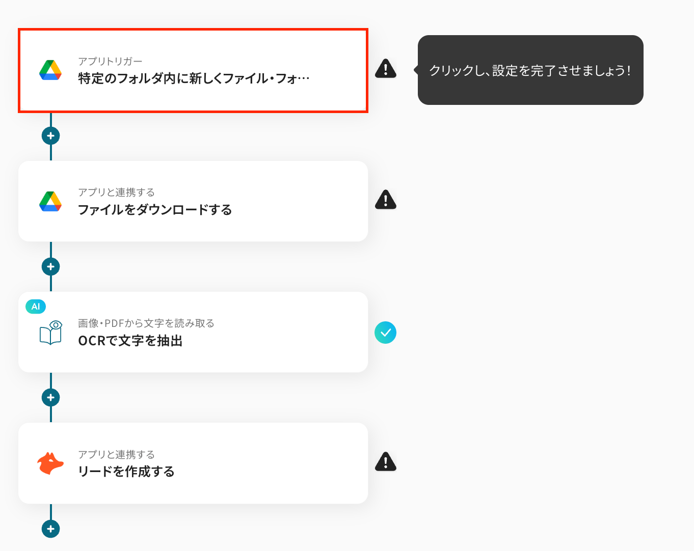 今回は「Google Driveで特定のフォルダ内に新しくファイルが作成されたら、OCRしてHunterにリードを作成する」フローを作成していきます!
