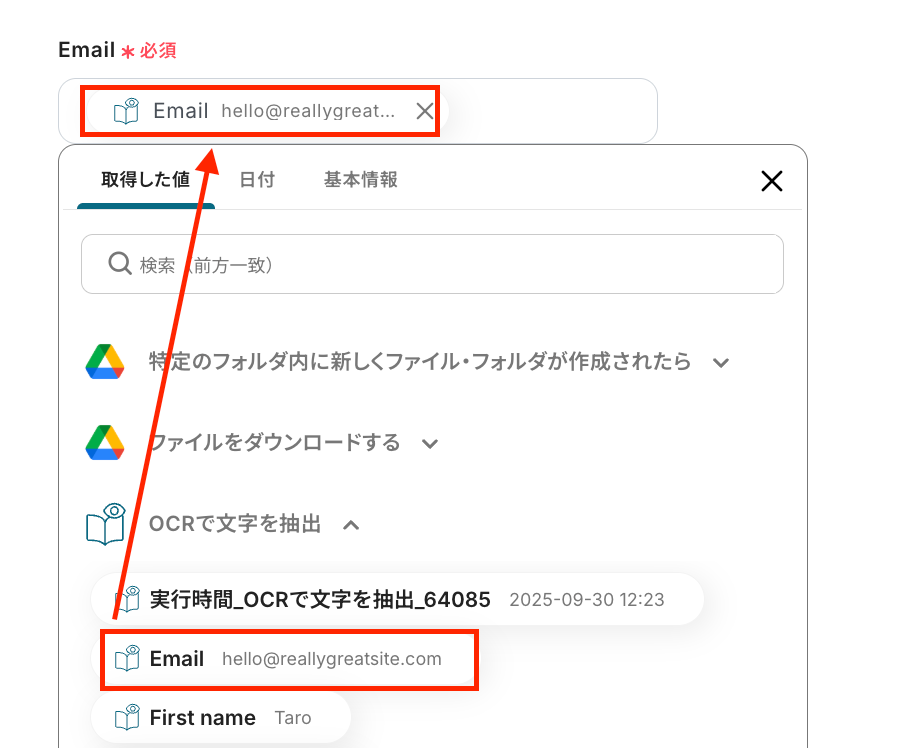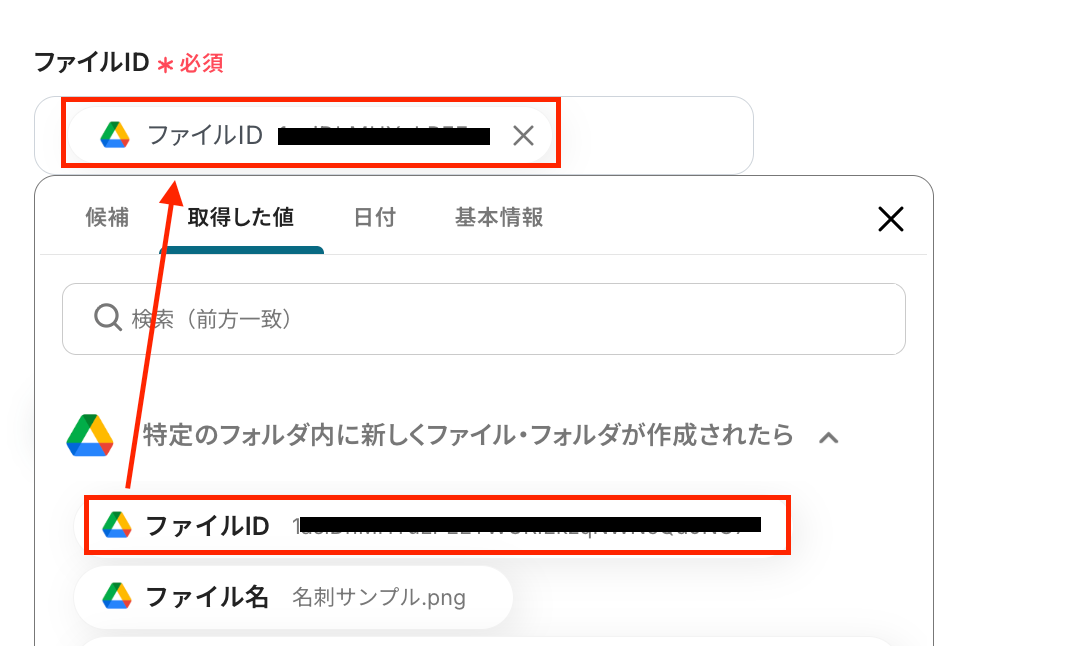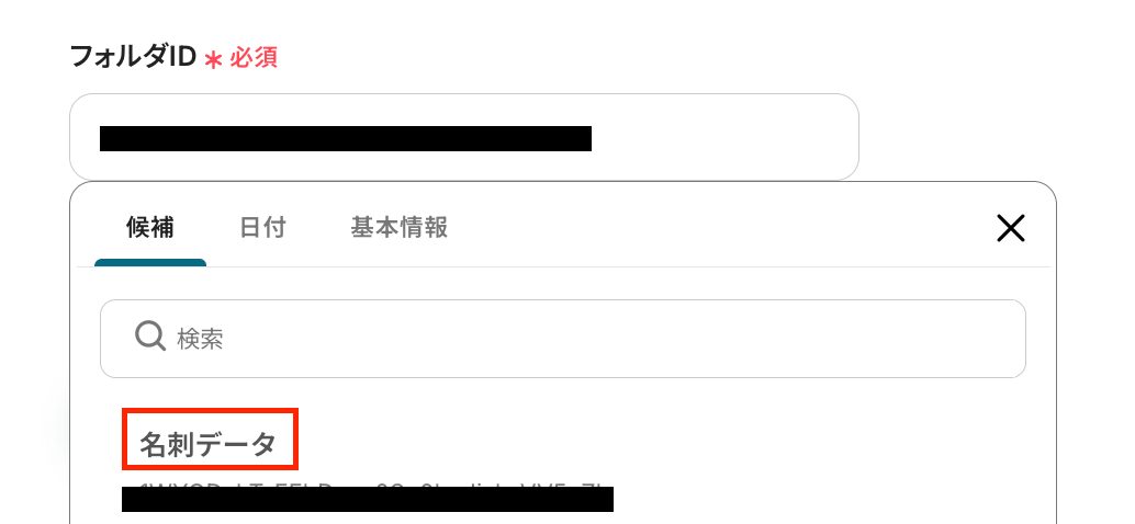 「フォルダID」は、入力欄をクリックして表示される候補から選択します。