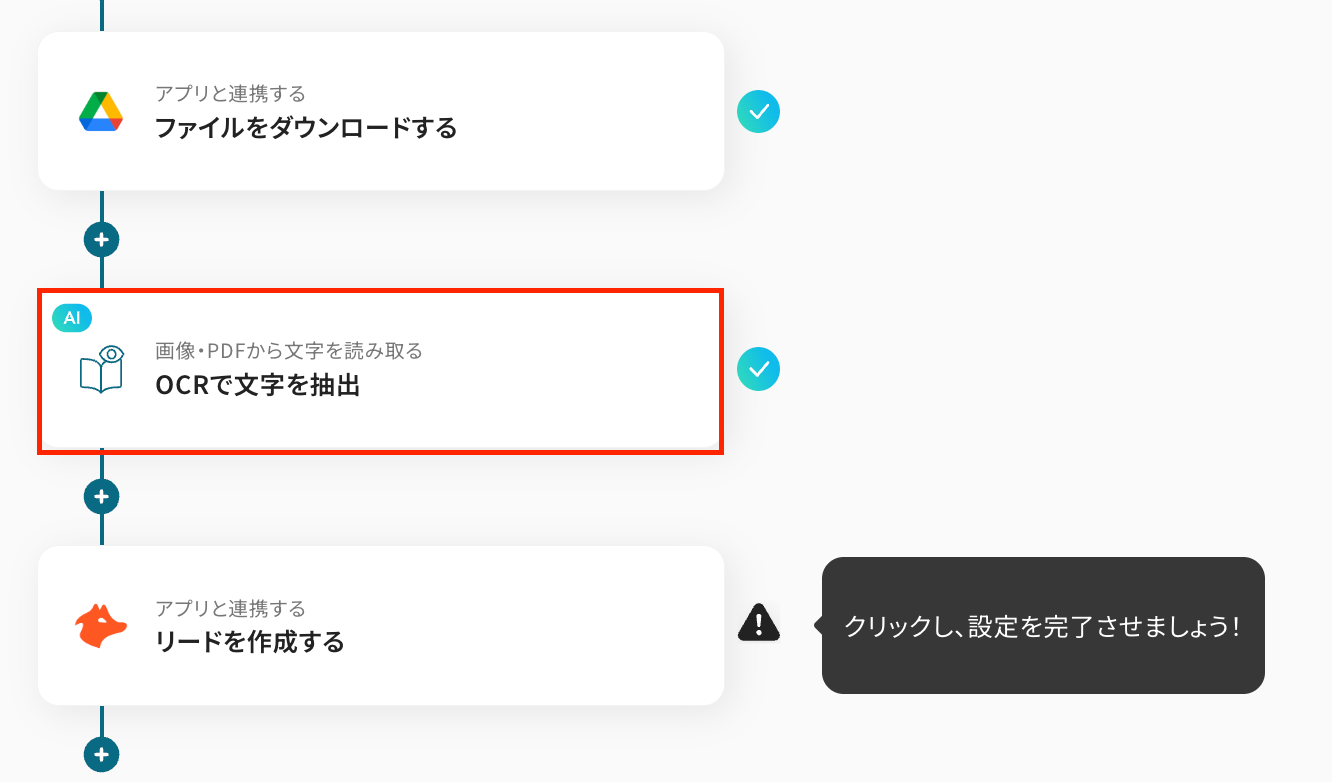 このワークフローは、Google DriveとHunterを連携させ、特定のフォルダにファイルが追加されるだけでOCRが情報を自動で読み取り、Hunterへリードを自動で作成します。