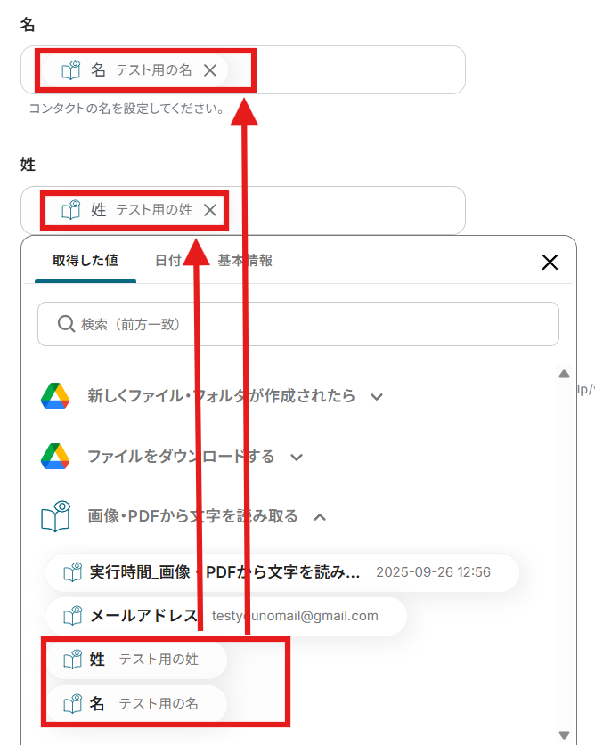 ※取得した値 とは? トリガーやオペレーション設定時に、「テスト」を実行して取得した値のことを指します。 後続のオペレーション設定時の値として利用でき、フローボットを起動する度に変動した値となります。