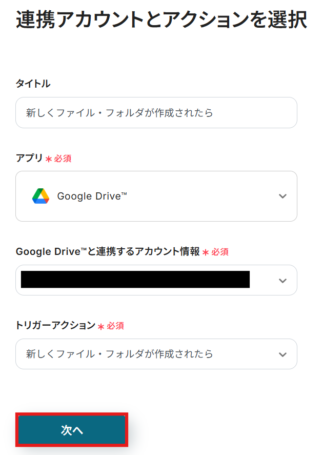 タイトルは任意でわかりやすいものを設定しましょう。 アカウント情報は、マイアプリ連携の際に設定したものになっているか確認してください。 アクションはデフォルトで入力されている状態のままで進めます。