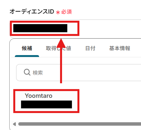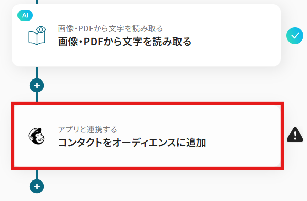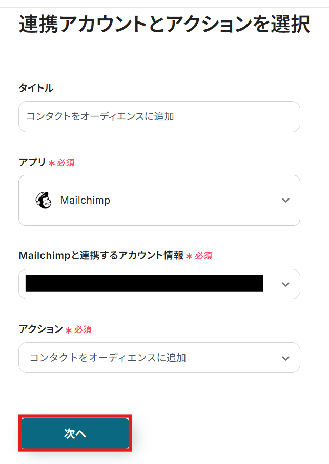 次に、Mailchimpのオーディエンスにコンタクトを追加するアクションの設定を進めましょう。 赤枠の「コンタクトをオーディエンスに追加」をクリックします。