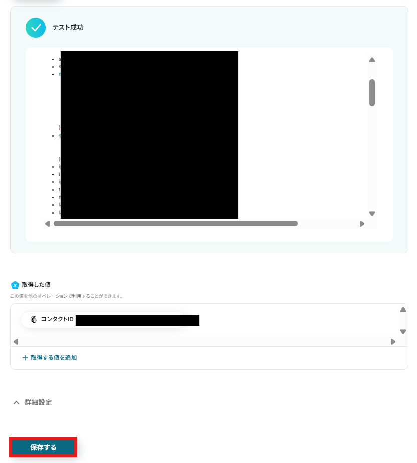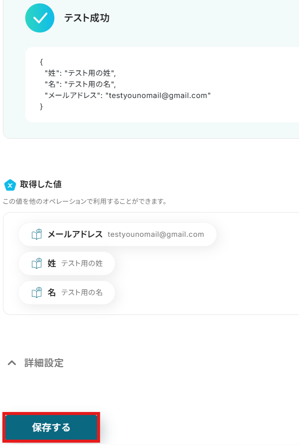 入力できたらテストを実行してみましょう。 テストが成功したら、「取得した値」が表示されます。