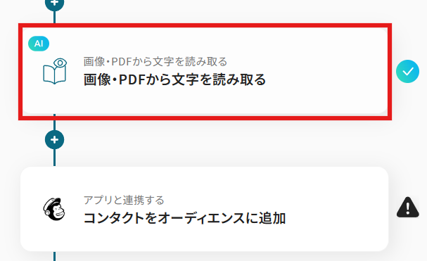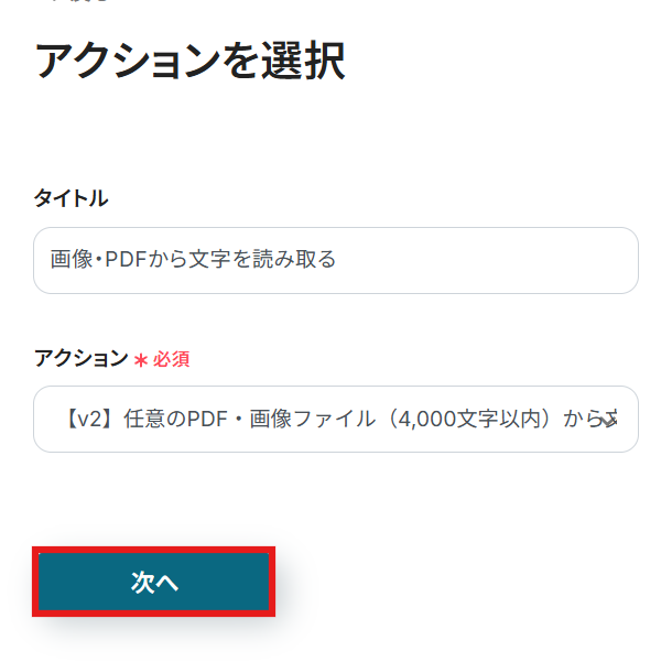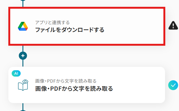 次に、先ほどダウンロードしたファイルから文字を読み取るアクションの設定を進めていきましょう。 赤枠の「画像・PDFから文字を読み取る」をクリックします。