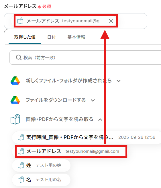 「メールアドレス」は、先ほど取得した値の中から選択します。 取得した値を活用することで、固定値ではなく、トリガーが実行されるたびに最新の情報が反映できます。