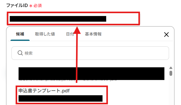 ファイルIDを入力します。 入力欄をクリックすると表示される候補の中から、先ほど用意したファイルを選択しましょう。