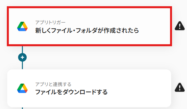 次に、Google Driveにアップロードしたファイルをダウンロードするアクションの設定を進めていきましょう。 赤枠の「ファイルをダウンロードする」をクリックします。 ※ダウンロードできるファイルの容量は最大300MBです。ただし、アプリの仕様によっては300MB未満になることがあるので、ご注意ください。 ※その他トリガーや各オペレーションで扱えるファイル容量の詳細については、以下もチェックしてみてください。 https://intercom.help/yoom/ja/articles/9413924