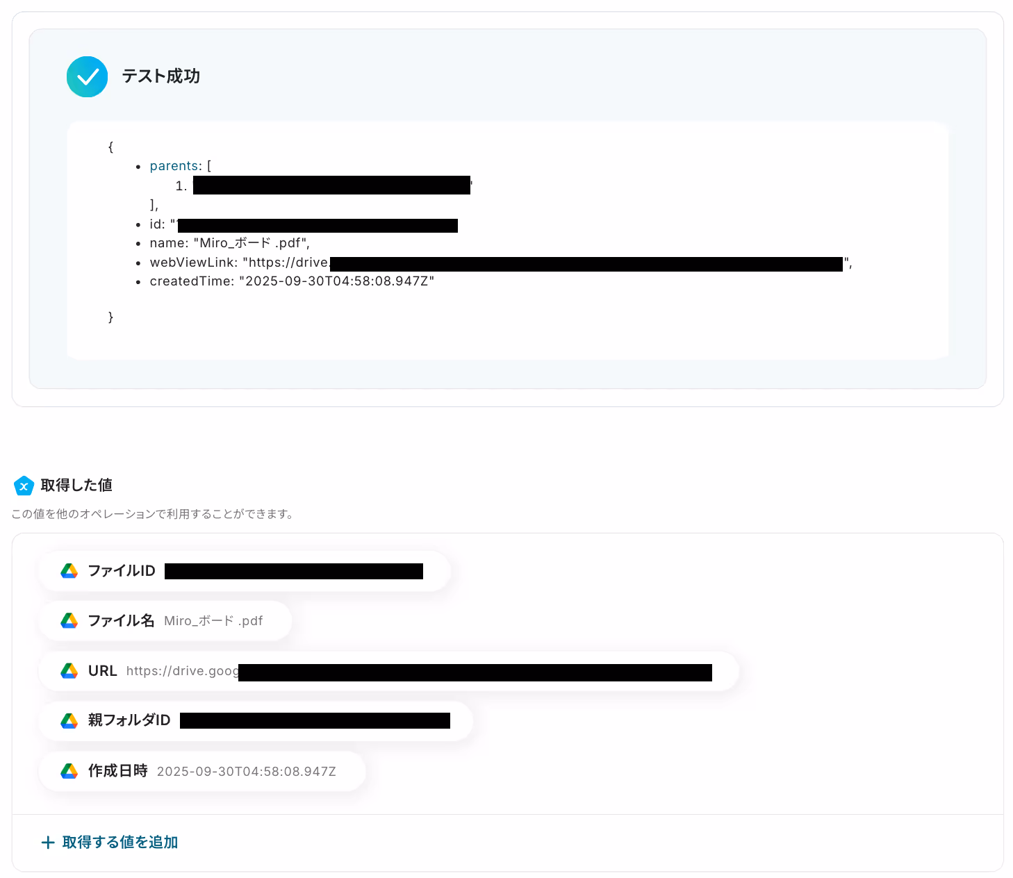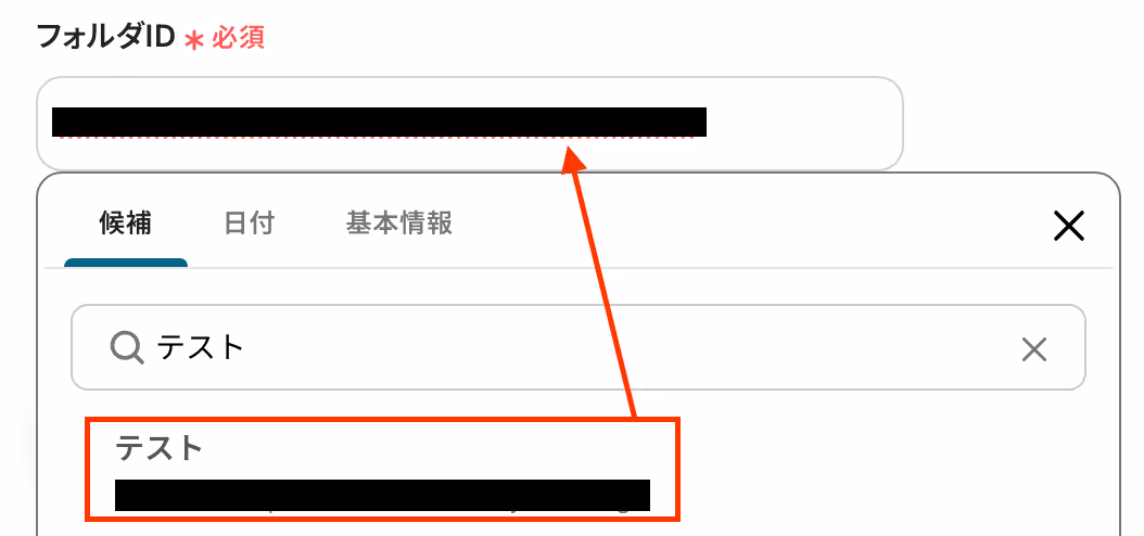ここでは、「ファイルID」を取得した値から引用して設定します。