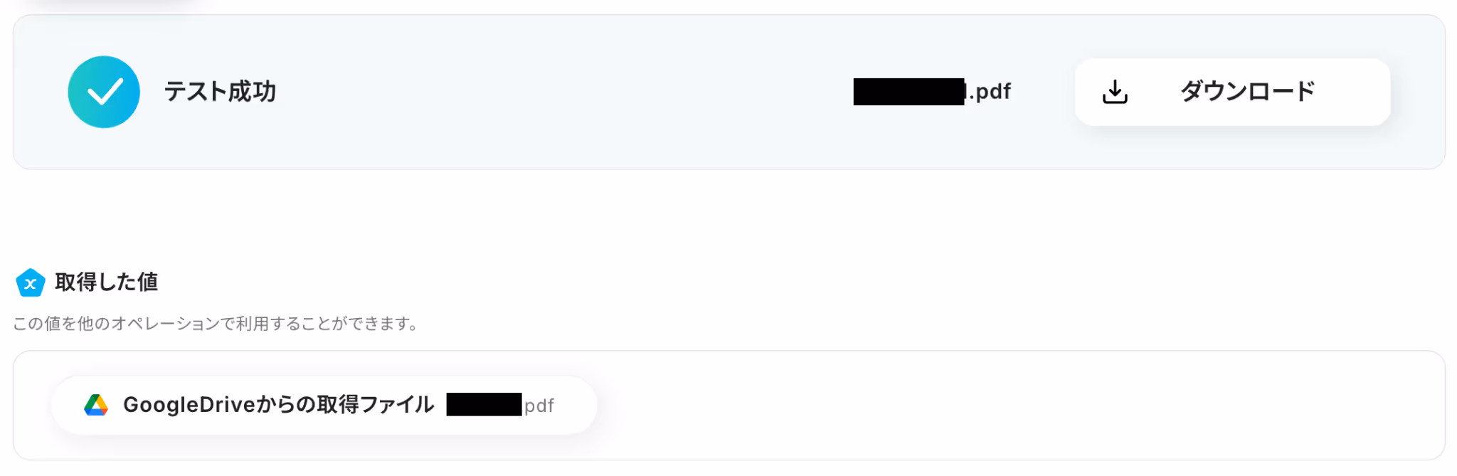 テストが成功すると、ダウンロードボタンと取得した値が表示されます。