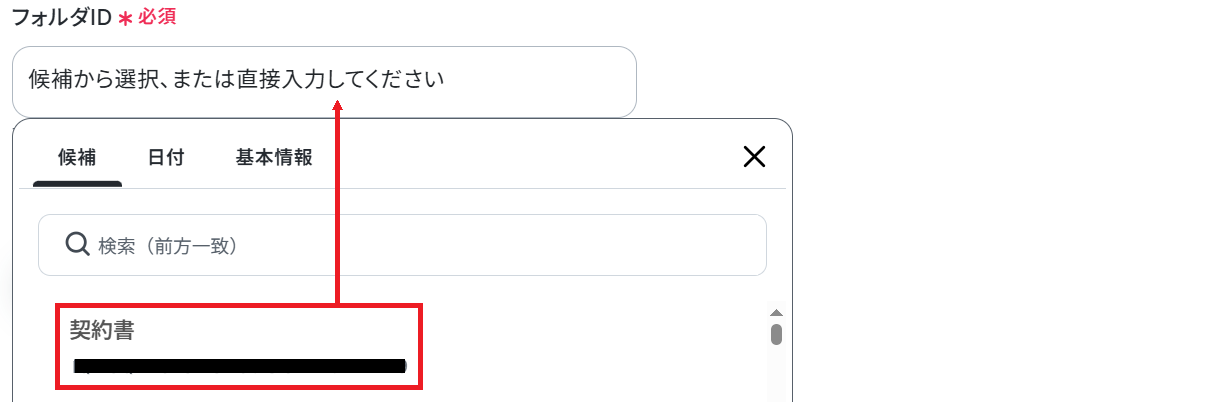 次に、先ほどファイルを格納したフォルダのフォルダID を候補から選択しテストしてください。