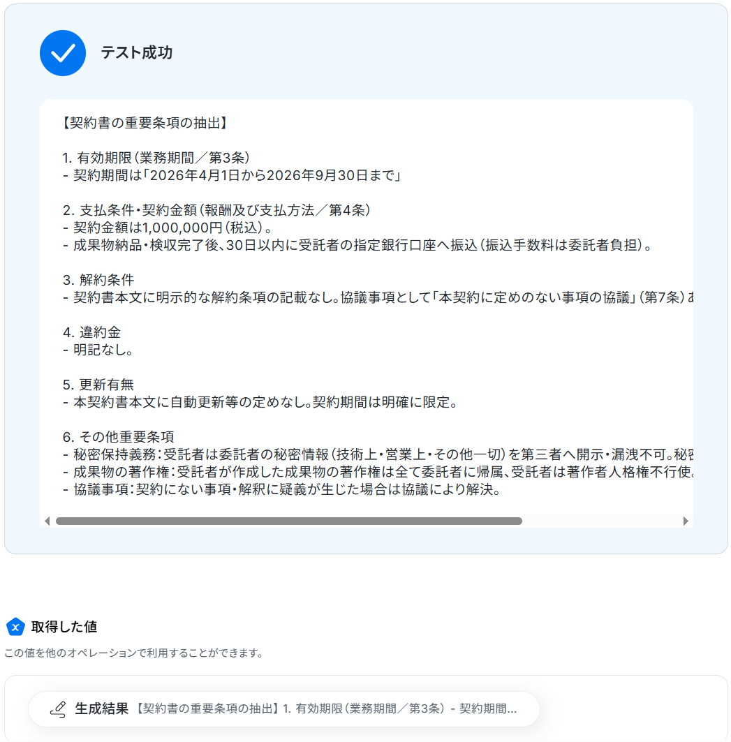 成功したら保存してください。AIがファイルの内容から重要条項を抽出してくれました!