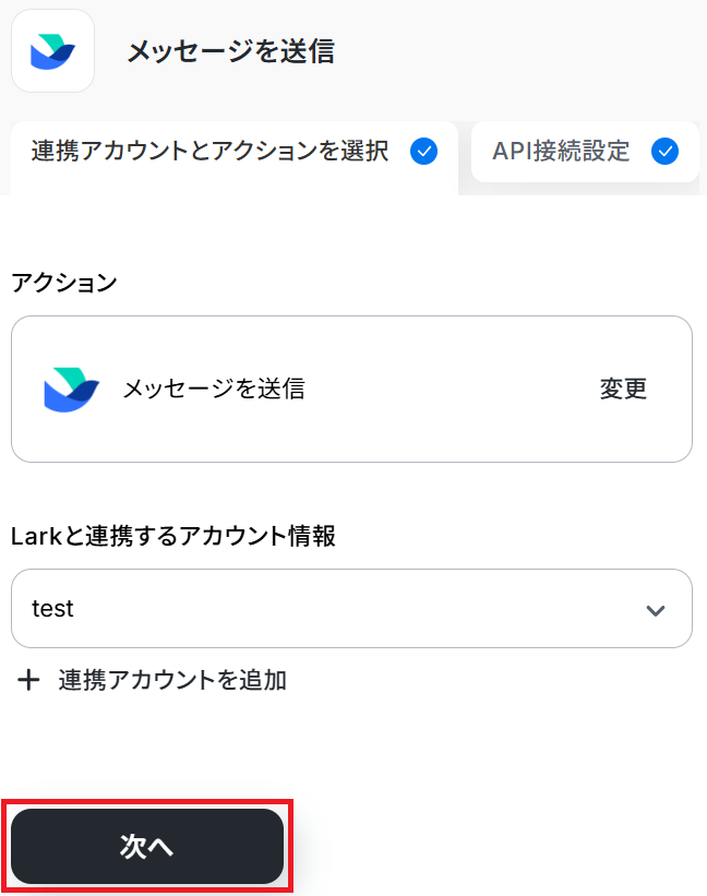 ステップ7:Larkのアクション設定 先ほど抽出した重要条項をLarkに通知します。「メッセージを送信」をクリックしましょう。