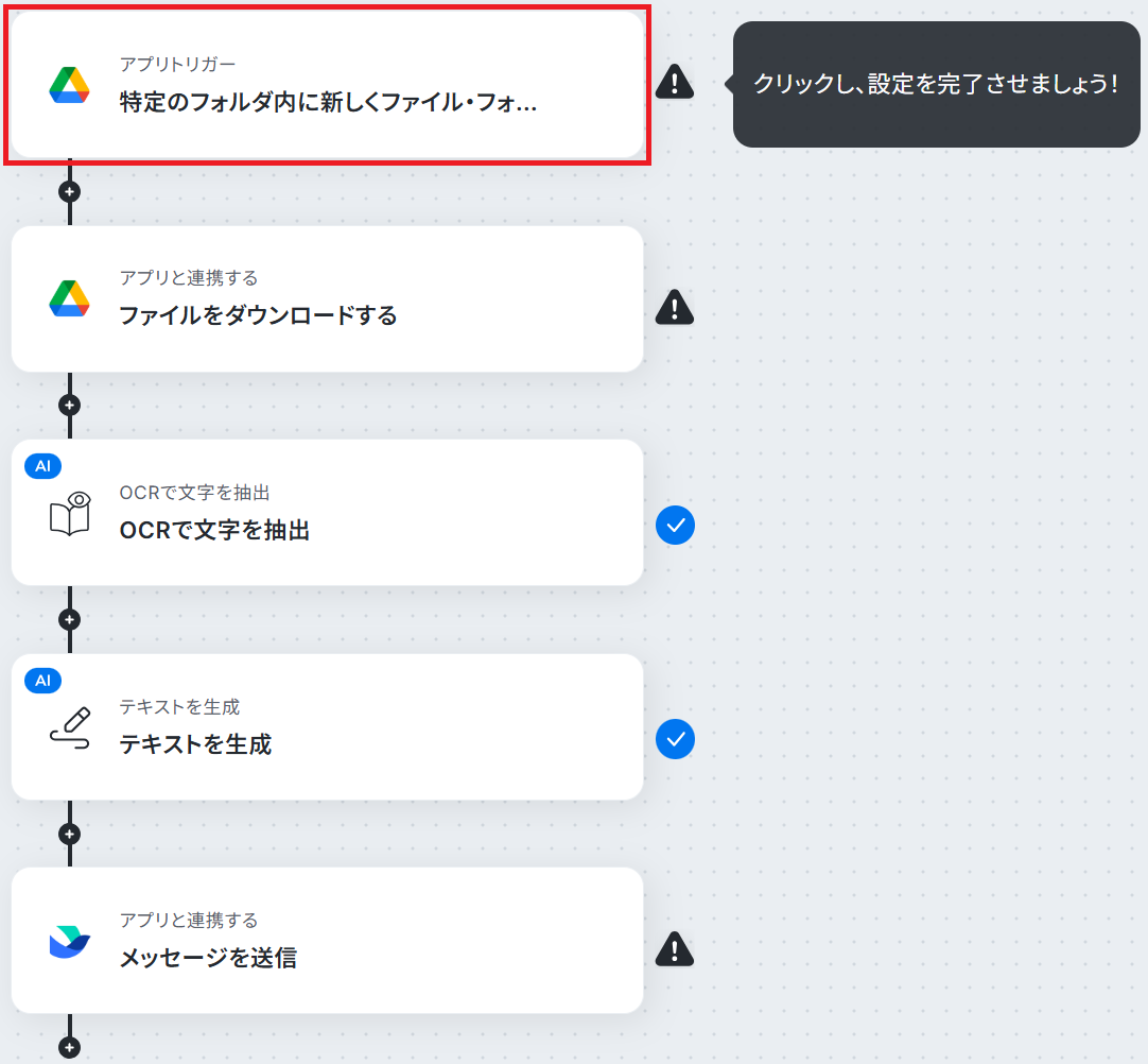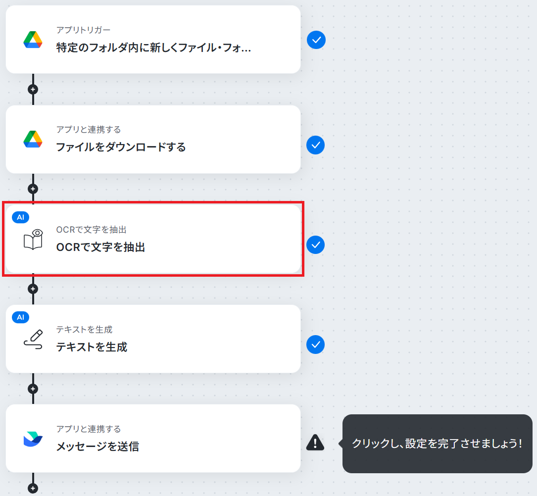 Google Driveのトリガー設定とアクション設定、OCR・テキスト生成設定、Larkのアクション設定