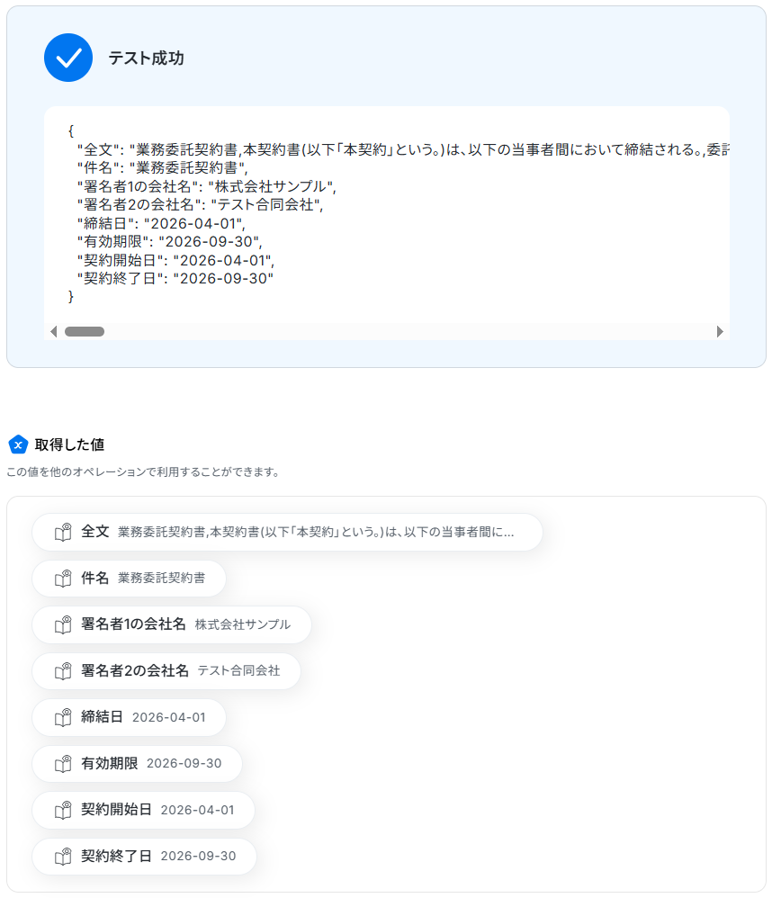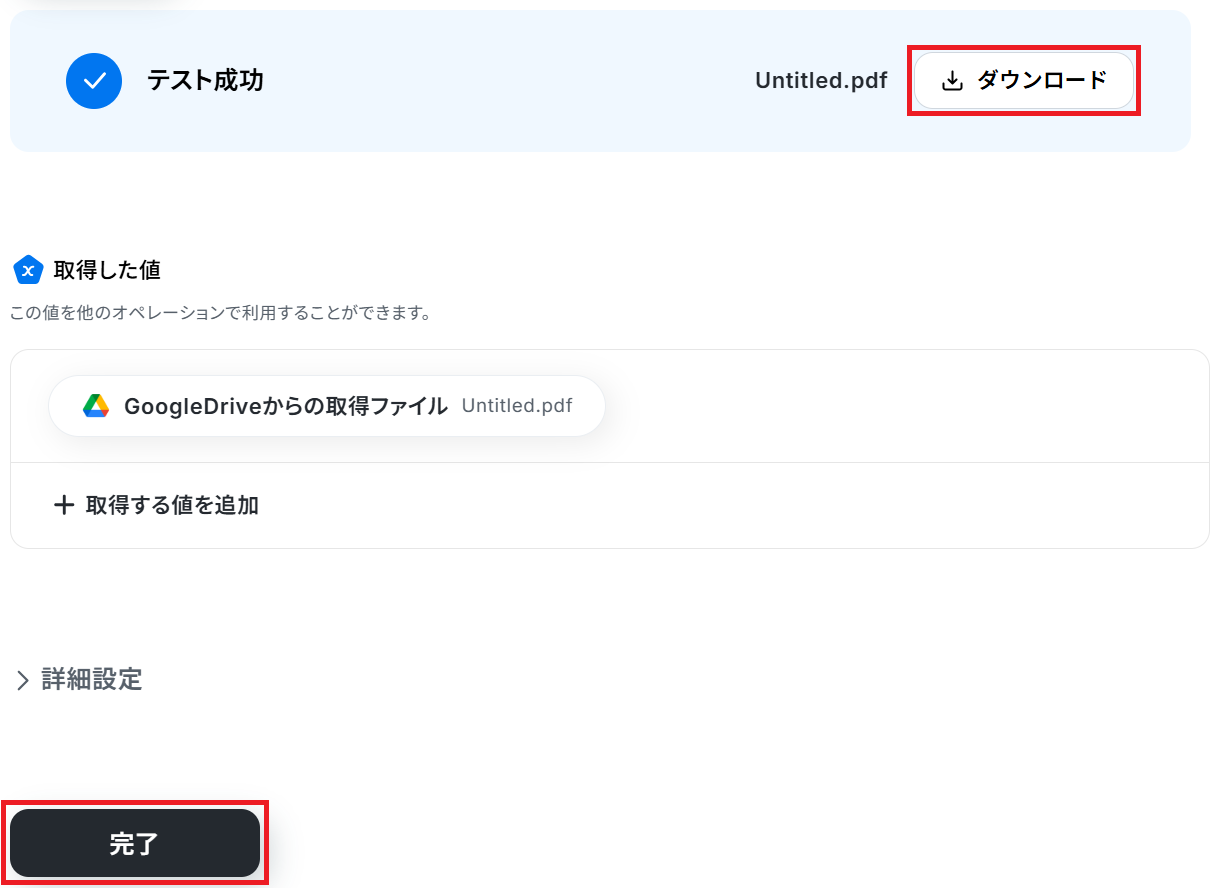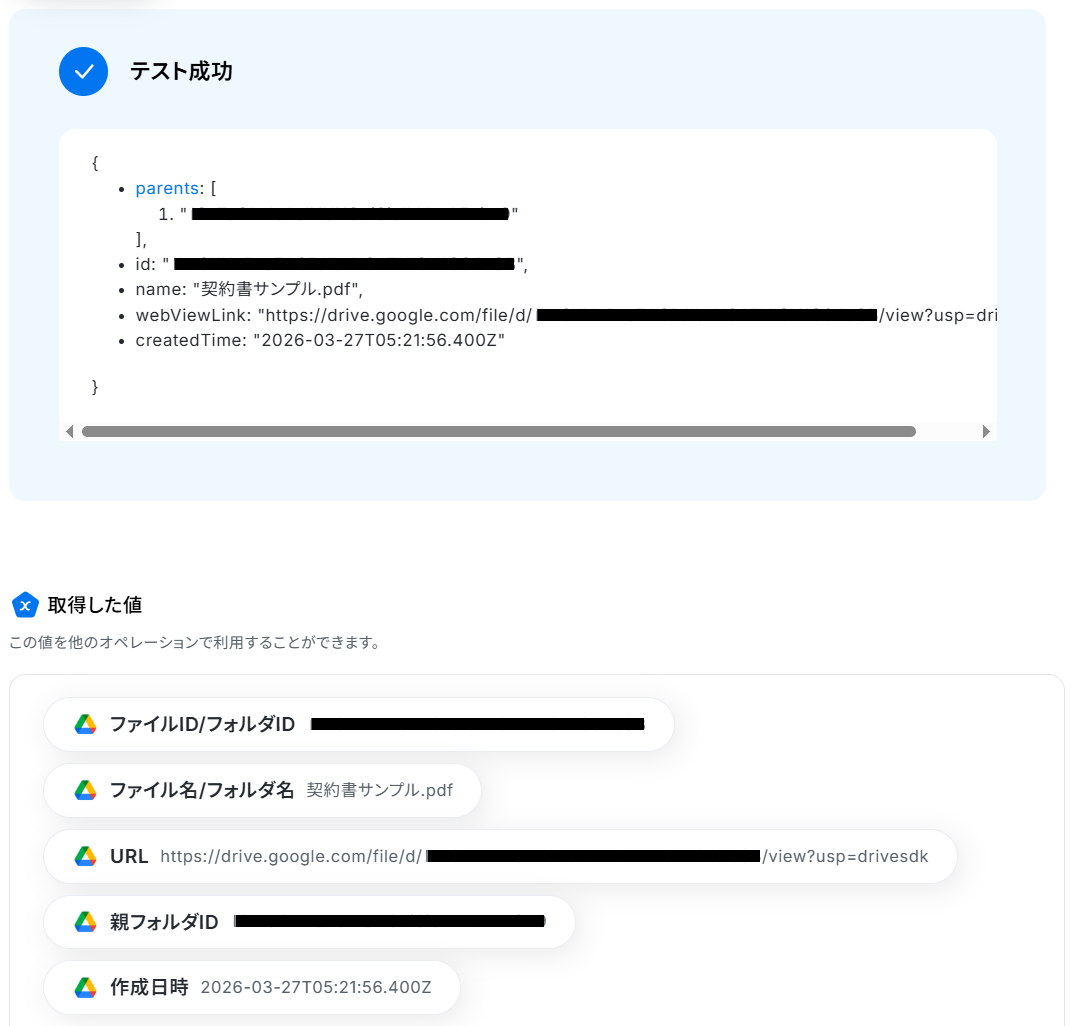 ファイルID の欄には、トリガーで取得した「ファイルID/フォルダID」の値が予め入力されているのでそのままテストしましょう。