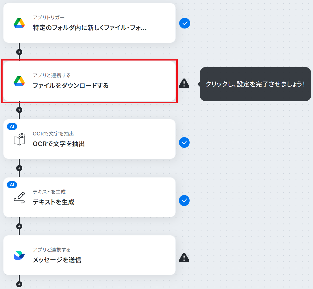 Dropboxのトリガー「特定のフォルダ内でファイルが作成または更新されたら」では、自動化の対象としたいフォルダのパスやファイル名を任意で設定してください。 Dropboxのオペレーション「ファイルをダウンロード」では、トリガーで指定したファイルが保存されているフォルダのパスを正しく設定してください。 OCRの抽出項目や要約の文字数などは自由にカスタマイズできます。 ■注意事項
