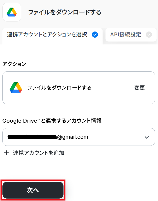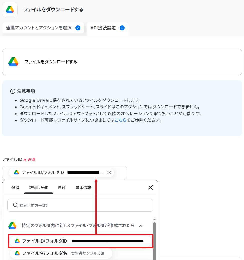 ステップ4:Google Driveのアクション設定 先ほど取得した情報をもとに、ファイルをダウンロードします。 「ファイルをダウンロードする」をクリックしてください。