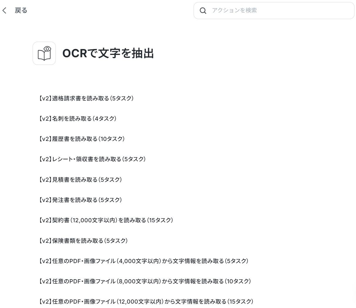 OCRのアクションは以下のような種類がありますので、用途に合わせて選択しましょう。 それぞれ()内のタスクを消費しますので、使用プランやデータの容量にご注意ください。