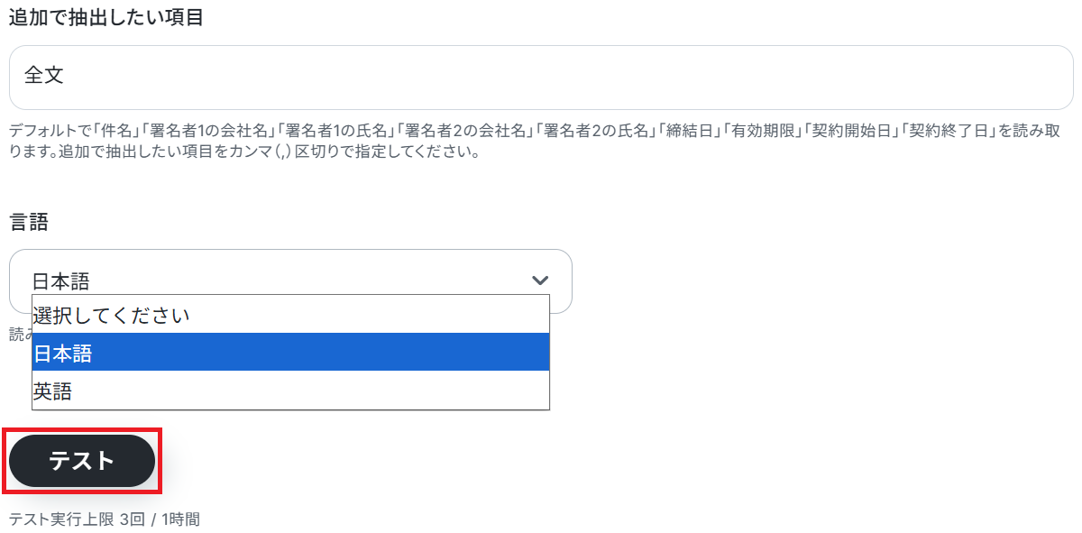 契約書の読み取りアクションではテキストボックス下部の項目をデフォルトで取得しますが、追加で抽出したい項目 も設定できます。 今回はファイル全体を読み取って重要条項を抽出するため「全文」と入力しました。 あとは任意で言語 を選択し、テストしてください。