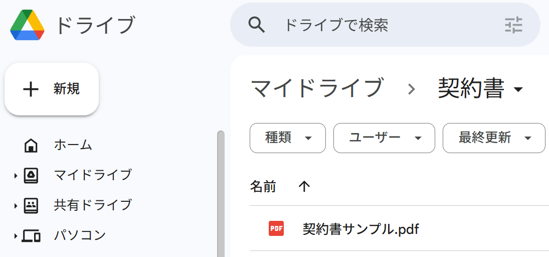 ステップ3:Google Driveのトリガー設定 はじめに準備として、Google Driveのフォルダにテスト用の契約書を格納しておきましょう。