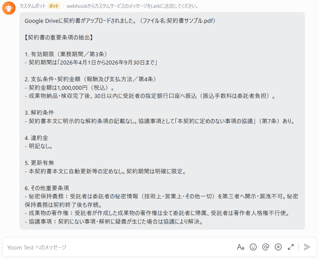 Google Driveに格納した契約書の重要条項がLarkに通知されました!