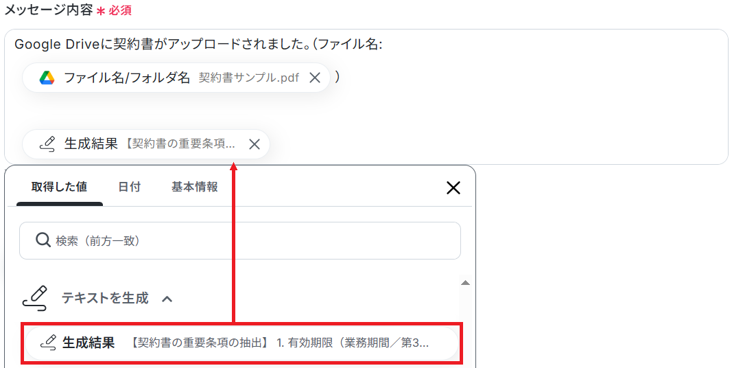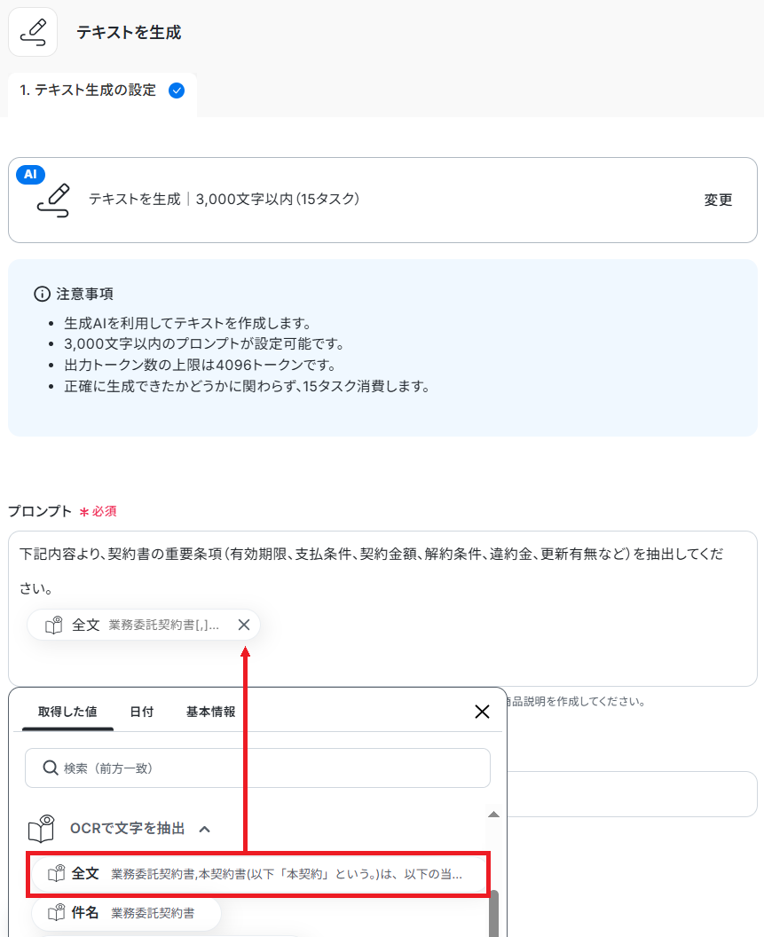 次にOCR機能から取得した「全文」の値や固定のテキストを組み合わせて、自社の運用方針に沿ったプロンプト を入力してください。