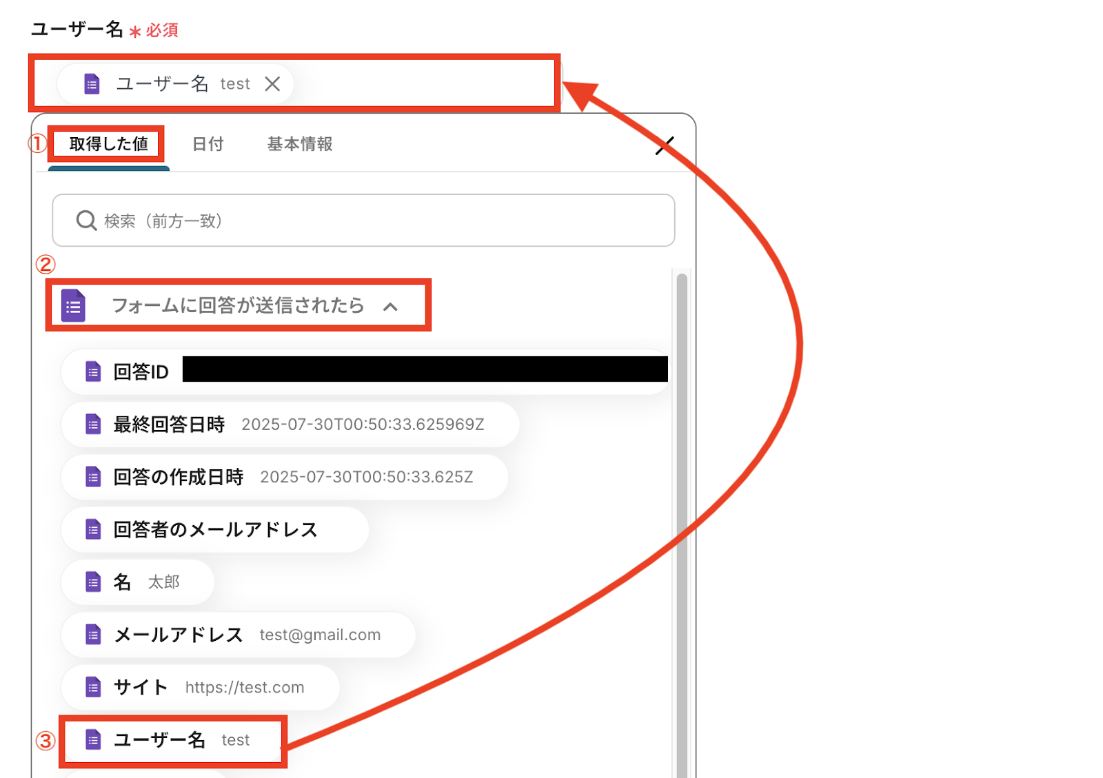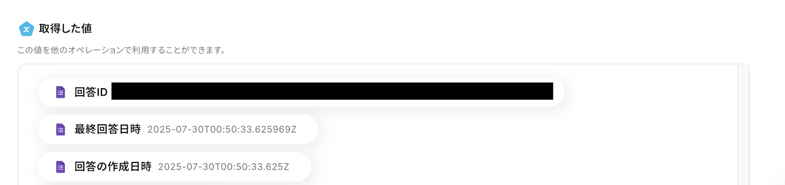 テストに成功したら、下までスクロールして「取得した値」としてGoogleフォームのデータがアウトプットされていることを確認しましょう!