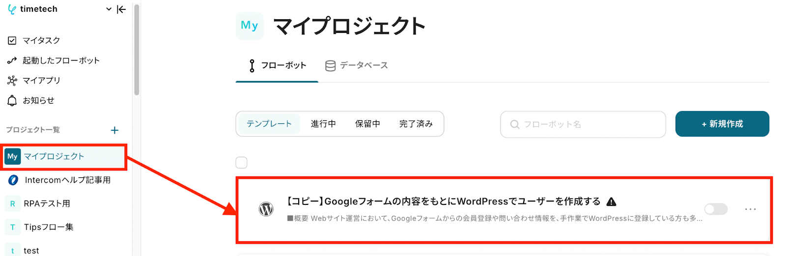 左側にあるメニューの「マイプロジェクト」から、コピーしたテンプレートを開きます。