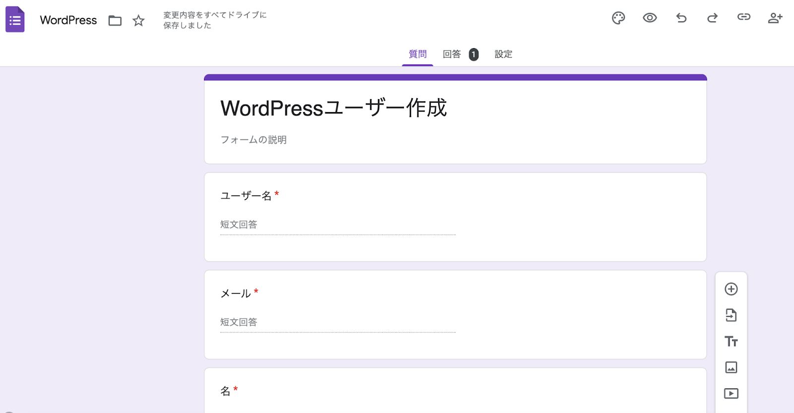 事前に、WordPressのユーザー登録に必要な項目を入れたGoogleフォームを作成しています!